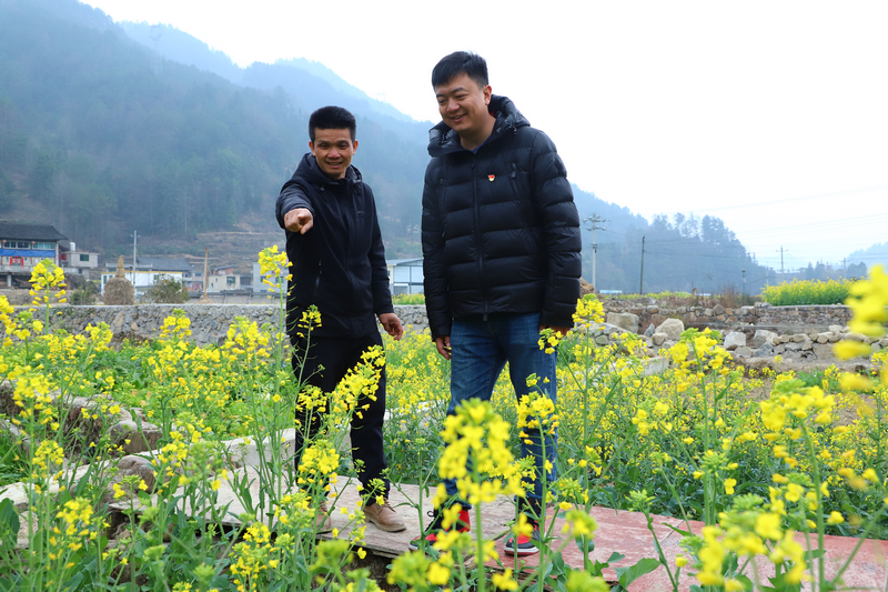 在阳基村的田间地头,一片片油菜花竞相开放、美不胜收。王向宁和吴成都一起走在田埂间,看着朵朵鲜艳的油菜花,两人一起谈论着今年的丰收,喜上眉梢。
